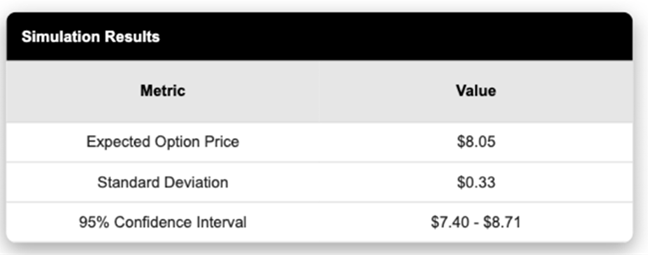 | 10,000 scenarios | The number of random simulation runs performed per calculation. More runs = more stable and accurate probability estimates. |